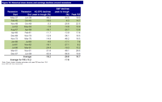Historiskt har vinsterna i genomsnitt fallit med 19% i recessions, samtidigt som SPX fallit med drygt 30%. De två senaste lågkonjunkturerna var iofs värre än så… så man kanske ska ta det med en smula salt.
