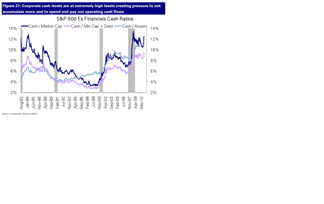 Hur kan företagen hantera en recession? Bra sägs det. Vinsterna kan kryma ihop, men med tanke på hur mkt cash som finns på balansräkningarna borde de känna sig rätt trygga. Varför är detta viktigt? Ett tryggt företag behöver inte annonsera nyemissioner eller omläggning av krediter (vilket får aktien att krascha), ett tryggt företag skickar inte hem sina anställda på samma sätt som ett företag i kris. Ett tryggt företag kanske investerar i ett annat bolag vars mcap fallit (förvärv av marknasandelar), de kanske väljer att göra investeringen som de väntat på då det är billigare, eller kanske köper tillbaks egna aktier som fallit mycket.