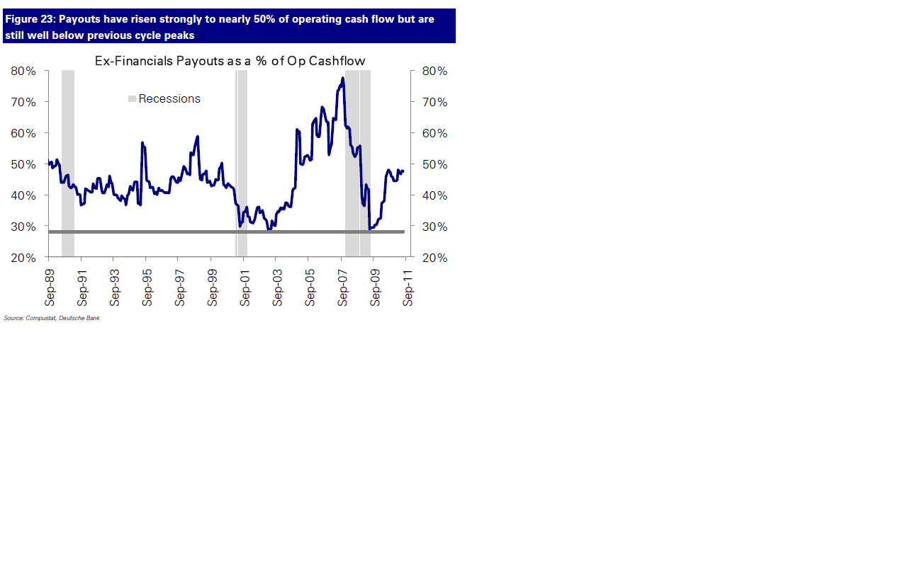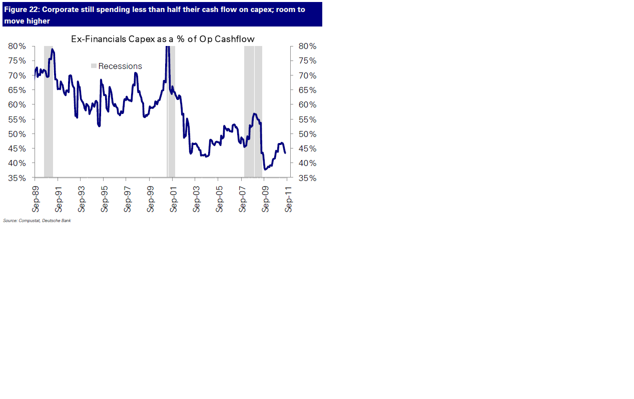 Cap ex spending har varit extremt lågt de senaste åren i förhållande till kassaflödena. Inte för att jag tror att Amerikanska företag bygger nya fabriker i Detroit, men de borde investera i EM (och på så sätt driva fortsatt tillväxt där) som gör att de på sikt tjänar ännu mer. De borde också öppna upp för återköp av akter och hyggliga utdelningar (vilket ger BBB corp bonds ett tuff match)…