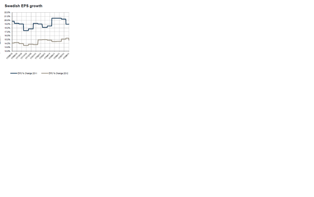 Hur har vi det i Sveige…. trots goda vinster, som media gärna skriver om, har vinstrevideringarna varit flat länge… både för FY11 och FY12. Inte konstigt att vi gått flat. OM världen går in i recession så ligger analytiker kåren fett efter. Men det gör dem alltid så det är inget konstigt. OM vi inte går in i RECESSION så slår de sig för bröstet och säger, vad var det vi sa! Så brukar det också vara!! Måste ändå säga att 15% vinsttillväxt 2012 känns mycket även om vi undviker recession