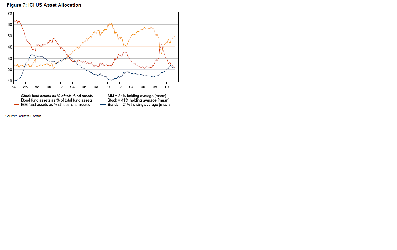 Amerikanske placerare har hyggligt mycket i aktier, och jättemycket i bonds. Aktier borde kunna gå högre om vi undviker recession.