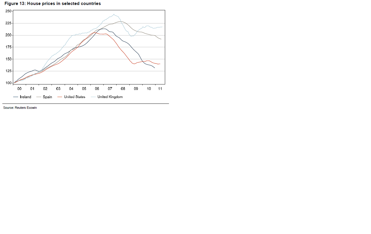 Huspriserna är en viktig faktor för banksektorns vinster (då fallande huspriser triggar kredit förluster och avskrivningar) och eftersom banksektorn är too important to fail, och därmed backas upp av staterna, och den här krisen handlar mycket om stater, så spelar huspriserna en rätt stor roll…. jag blir lite orolig när jag ser Spanien! OM huspriserna i Spanioen sjönk med 30%, så får spanska överbelånade banker problem, vilka måste rädas av spanska staten, som i sin tur måste räddas av ECB typ…
