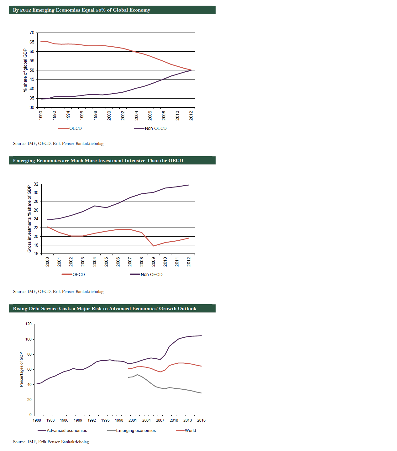 Rapporterna , övervikta EM blir bara fler och fler. Några snabba charts nedan visar att non oecd länderna numera utgör en lika stor del som oecd länderna, att investeringar i EM nästan dubbelt så stora, och borde därför driva framtida tillväxt samt EM är relativt obelånat vilket borgar för fortsatta investeringar… old news to us, men ändå!!!