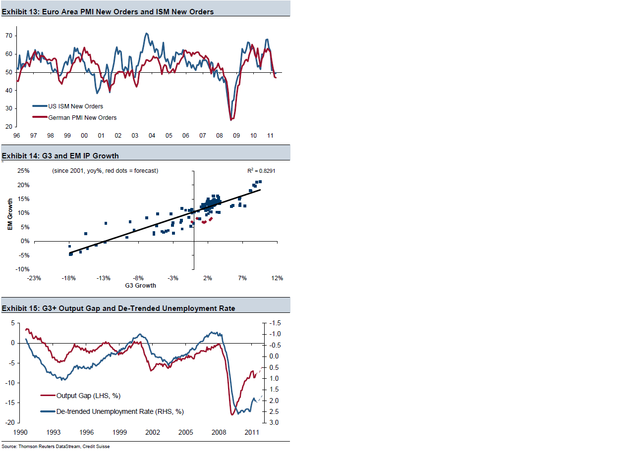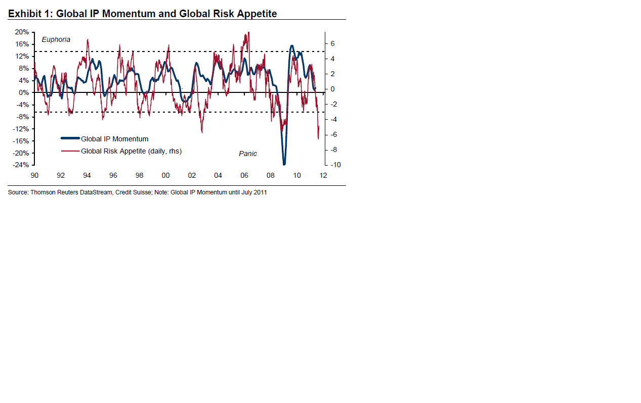 Credit Suisse slår fast att ledande indikatorer och sentiments indikatorer pekar på rejält sämre tider. Samtidgt är hård datan över nuet stark. Nedan visar Idustriproduktionen globalt. Har indikatorerna rätt ska den kollapsa i höst. Men det kan lika gärna vara så att politkerna skrämde siffrorna i augusti, och det är dem som ska repa sig istället.