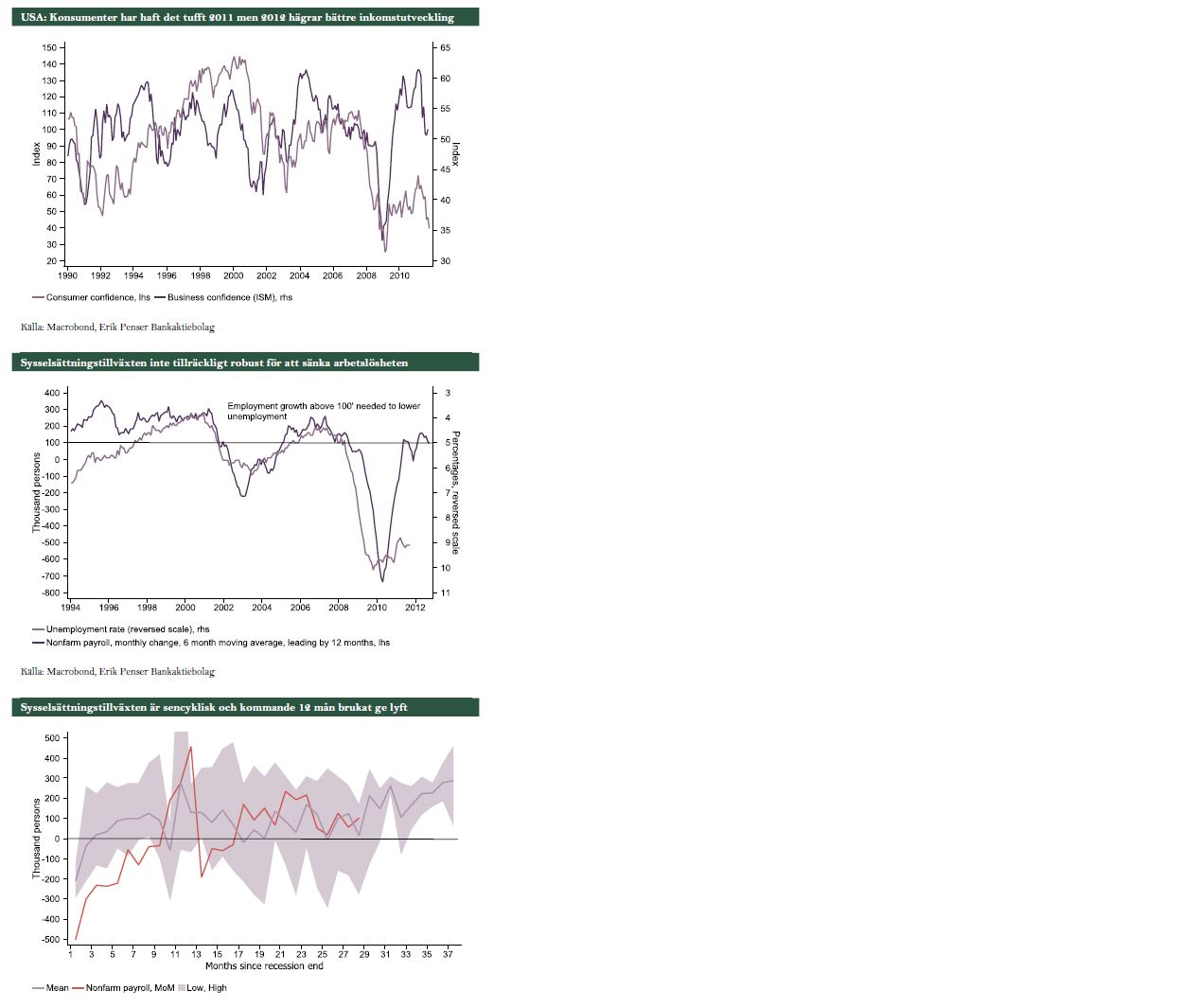 Pessimisterna hävdar att bnp inte kan växa när REALA disponibla inkomsten inte gör det i USA. Det förefaller ju vara logiskt med tanke på att 70% av US BNP består av privatkonsumtion. MEN, notera att det är REAL disp income. Inflationen har drivit ner den mot noll. OM inflationen faller tillbaks under Q411 och framöver så kommer reala disp income att ta fart… och därmed hjälpa konsumtionen, och därmed BNP framöver. Det behöver inte vara så illa ställt. Sen måste vi fråga oss vad som händer med lönerna. Tja, tror du inte på stigande arbetslöshet, utan som jag att den ska ligga kvar på nuvarande nivå och kanske växa med snitt 100,000 jobb… ja då borde det inte vara nåt problem.