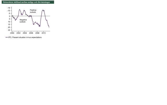 Tittade på Tyska IFO. Sedan i somras har det varit ganska uppenbart att Eurozonen är på väg in i någon typ av recession. Samtidigt har hårddatan som beskriver dagsläget varit helt OK. De som deltar i IFO undersökningen delar den här synen också. Nuläge minus förväntningar är på rekordnivåer. Going forward väntar jag mig att hård datan faktiskt börjar rulla in dåligt (vilket den faktiskt redan börjat göra) och frågan är hur mycket lägre Förväntningsdelen kan gå….