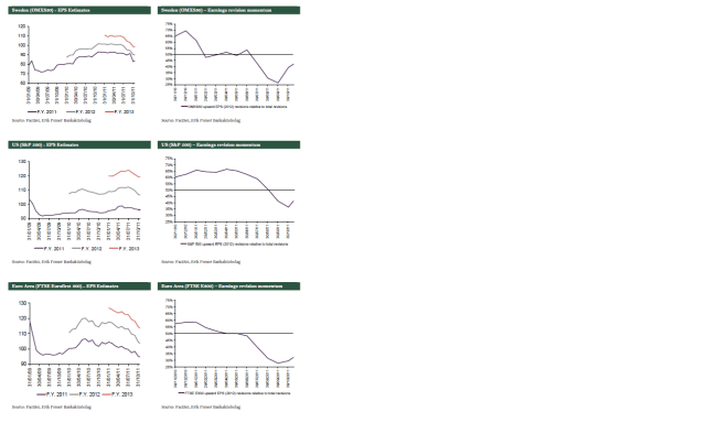 Nåja, kris och politik. I slutändan är det ändå vinsterna det handlar om! I samtliga marknader har vinsterna för i år, 2012 och 2013 reviderats ner under hösten. Det vi kan se den senaste månaden är hur takten har avtagit. Makrodatan har faktiskt inte varit så dålig som befarat och därför lugnar man sig att skruva ner vinsterna yttelrigare. Visst, den kan ta fart igen! Den här utvecklingen följer jag noga. Notera att 2012 års EPS är fortfarande högre än 2011. Tillväxt än så länge… alltså ingen recession finns i beräkningarna.