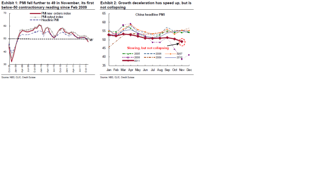 Mitt i alla hausse nyheter kom det China PMI i natt. Nationella indexet sjönk från 50,4 till 49,0, väntat var 49,9. Delindex Nya Orders var ner från 50,5 till 47,8. Även HSBC China PMI sjönk mer än väntat, från 51,0 till 47,7. Detta är svagt, no doubt… men frågan är inte om det beskriver HISTORIA. Dvs man har stramat åt länge nu, det kan vi se i tillväxt, inflation på sistone, bankutlåning, M2 mfl och nu senaste PMI. Framtiden däremot handlar om vad PBoC hittar på härnäst, och med tanke på deras RRR sänkning så kan vi förvänta oss mer stimulanser framöver…. och med lite tur bättre PMI på några månaders sikt? De Asiatiska börserna verkar vara inne på samma spår då de bortsåg från datan och rusade på RRR sänkningen och ett starkt USA istället! Credit suisse är inne på att kommande stimulanser mer riktar in sig på privatkonsumtion än, som under 2009, på infrastruktur. Exakt hur detta går till vet jag inte, men det låter väl förnuftigt. Det skulle innebära att råvaror kanske inte rallar fullt så mycket som sist. Svårt att säga såklart!
