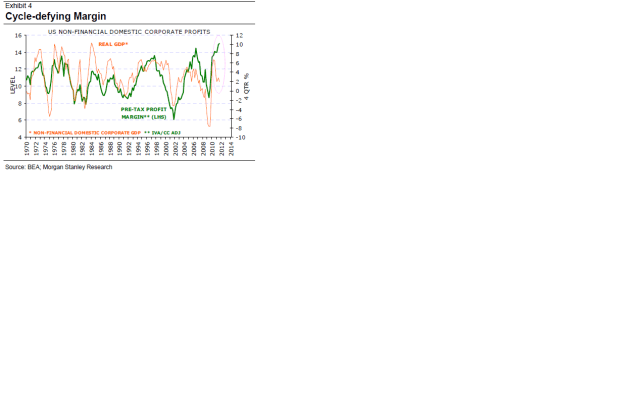 I USA har vinstmarginalerna svängt med konjunkturen historiskt. Men inte lika mycket den här gången! Men frågan är hur länge de kan divergera?