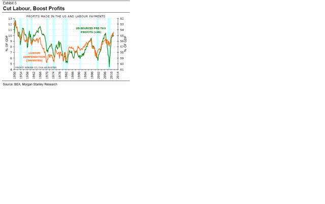 Anledningen är att företagens största kostnad, lönerna, har kunnat hållas nere. Lönerna som andel av BNP ligger faktiskt på 50 års lägsta….