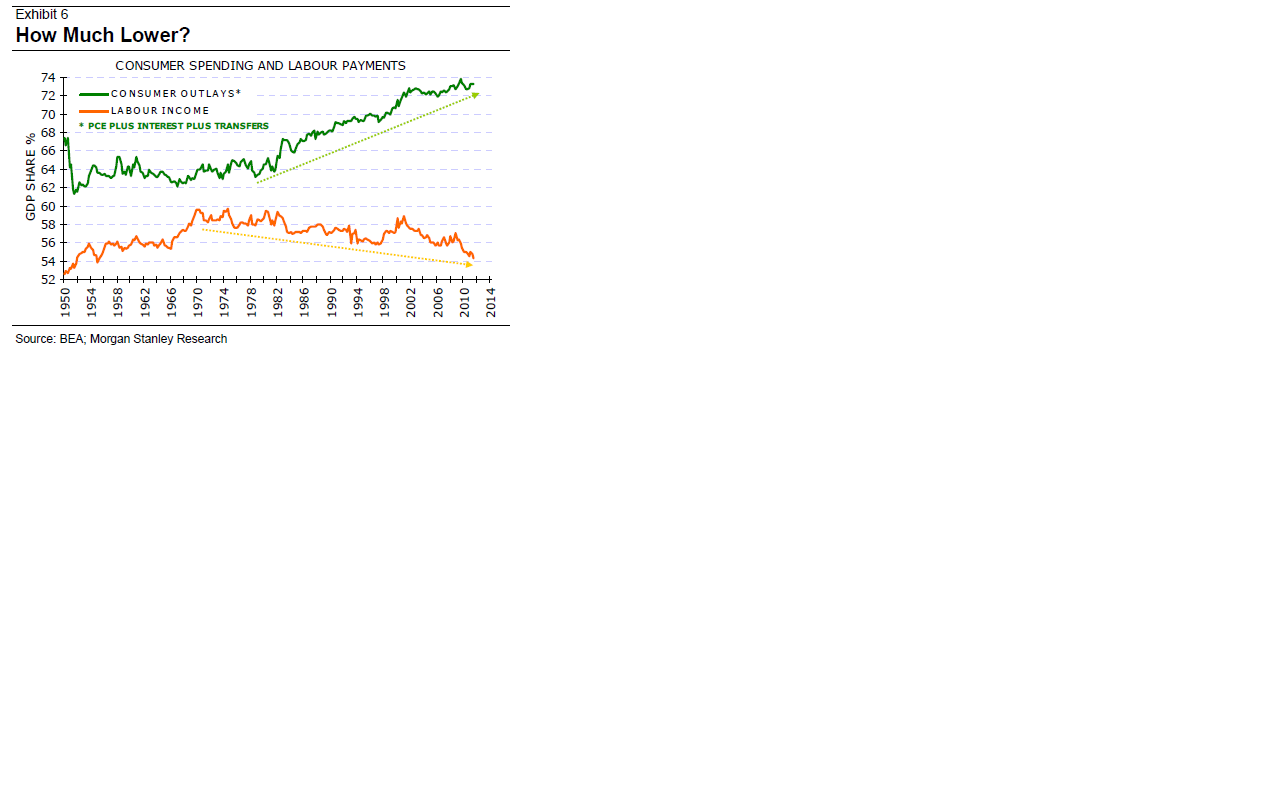 Samtidigt som lönerna blir allt mindre, noterar konsumtionen (inkl transfers och räntebetalningar) på rekordnivåer. Detta är en divergens som pågått länge nu….