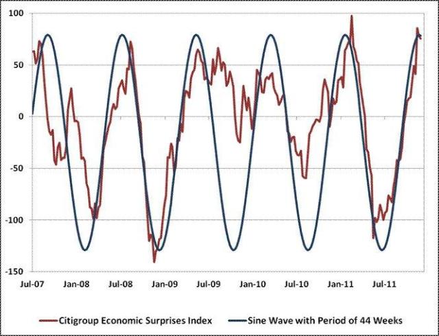 Nåja, det är inte konstigt att US data ska börja komma in sämre än förväntningarna framöver. Tror marknaden till viss del väntar sig detta. Vad innebär detta? Tja, att SPX får svårt att ralla vidare, men kanske inte kollapsar till gamla bottnar. Tråkig range bound börs med andra ord?