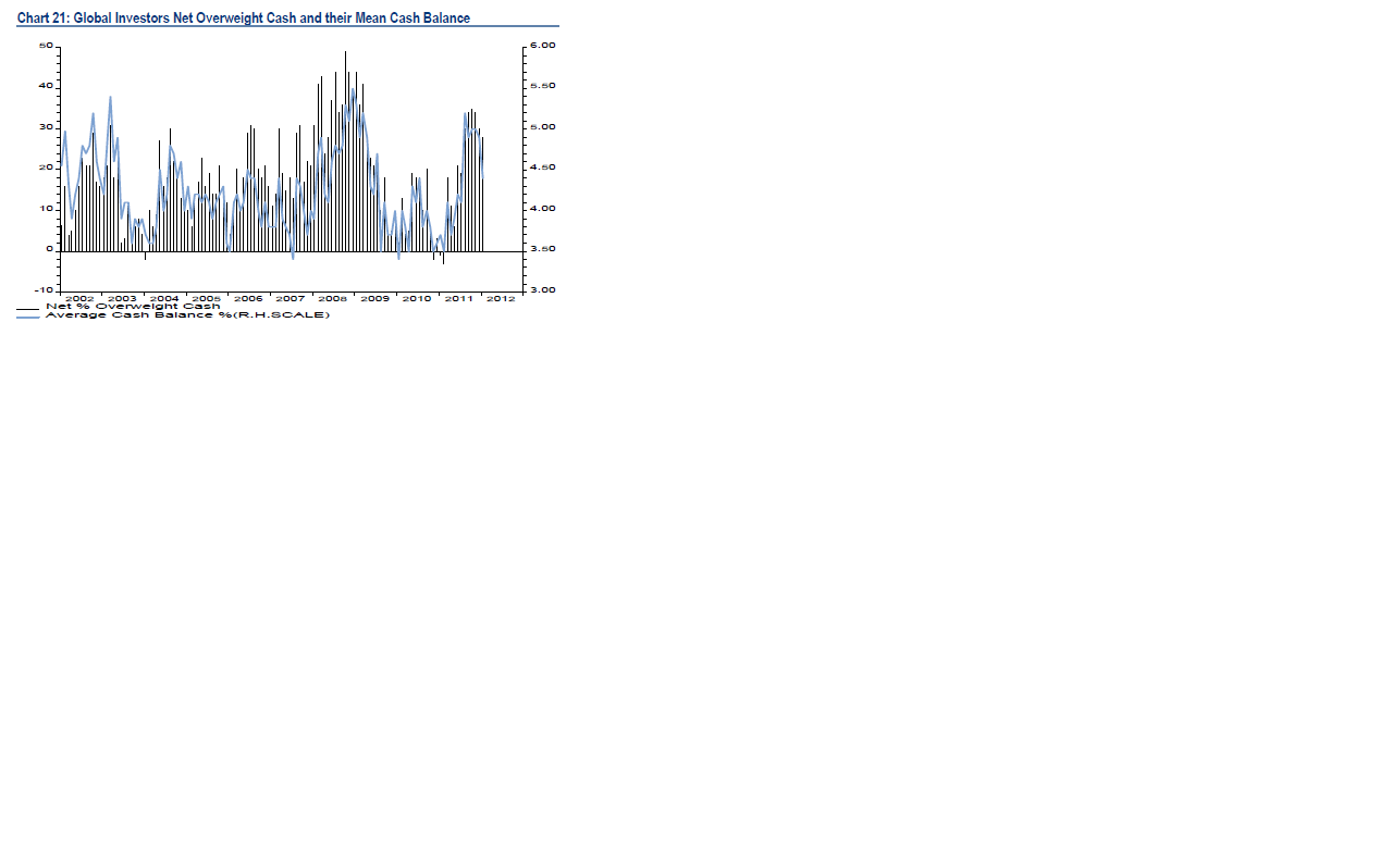 Kassorna är väl fyllda, inte riktigt så välfyllda som under 2008… och de har börjat vända ner! Man kan säga att de är lite lagom. Kommer dålig data, finns det att ta av. Dvs mer cash att raisa, å andra sidan finns det mer risk att handla för om datan skulle överraska….