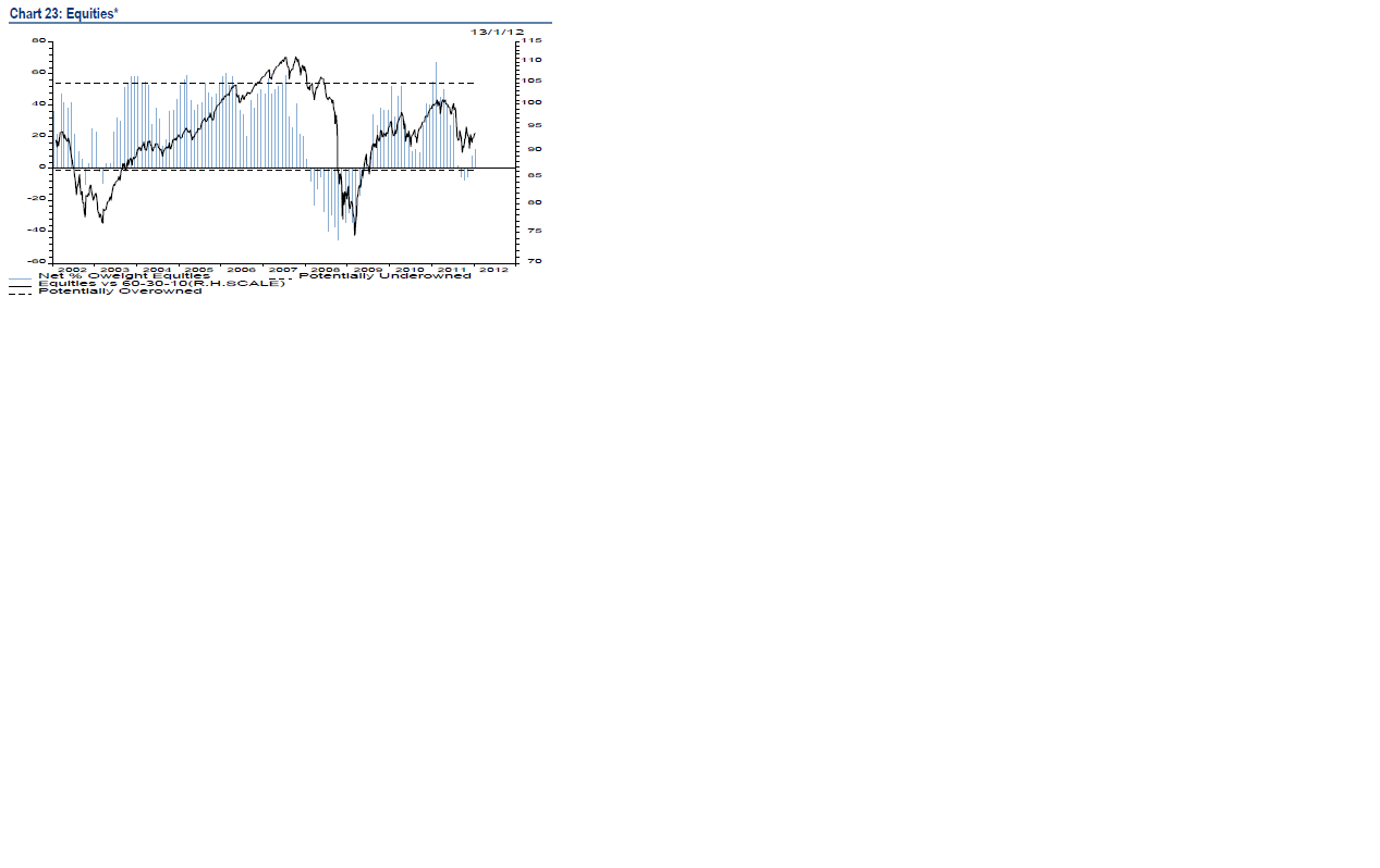 och som ni kanske förstår har man väldigt lite aktier. Okej, inte så lite som under 2008, men väl i nivå med 2002/2003.. detta betyder att det mycket väl kan falla till gamla höstbottnar om datan surnar till igen. Men det betyder också att skulle Europa överraska positivt så räkna med ett rally likt det 2009!