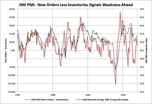 En sista notering är den viktiga ISM New orders / Inventories. Den har vänt ner, och den brukar förr eller senare leda stora indexet!
