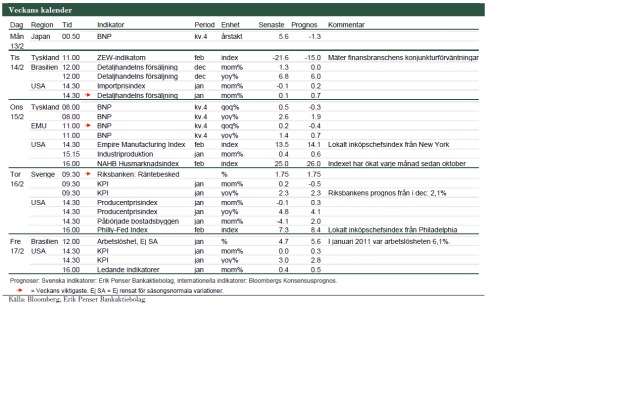 Veckan bjuder på lite blandad data. Detaljhandel från USA imorgon. BNP i Europa brukar få mycket plats även om den är lagging. Empite State på onsdag. Philly Fed och PPI på torsdag. CPI på fredag.