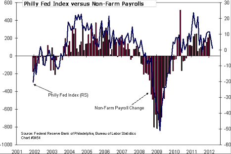 Såg nedan chart. Man härleder alltså Philly Fed employment faktor. Skulle jobben komma in på 50k… ojoj, då är det garanterat rekyl!