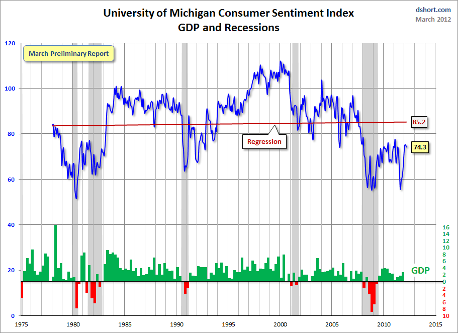 STOCKHOLM (Direkt) Det index som University of Michigan publicerar varje månad över stämningen bland de amerikanska konsumenterna sjönk till 74,3 i mars jämfört med 75,3 föregående månad. Det framgår av preliminära siffror på fredagen, enligt Reuters. Analytikerna hade väntat sig ett utfall på 76,0 enligt en enkät från Bloomberg News.