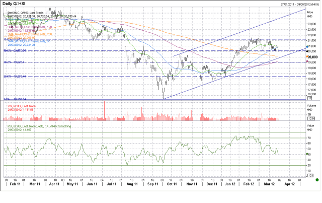 Asien har tidigare varit väldigt leading tekniskt sett. Fundamentalt har det spelat, och spelar, en leading roll i världen. Utan Kina/Asien hade tillväxten i världen varit högst medioker, och deras förmåga att tillverka billiga varor åt oss i väst påverkar vår inflation och hushållsekonomi. Deras aptit på råvaror och import av mer kapitalvaror och annan teknisk utrustning är också en viktig faktor. Efter uppgången i januari har Asien varit flat. Jämför det med SPX +6% och OMX 7% (i dollar). Känns som att Asien förtjänar det med tanke på att förväntningarna om den framtida tillväxten har mattats av på sistone RELATIVT hur förväntningarna har förändrats till det mer postiva i USA och Europa. MEN, the big MEN, det är frågan om Kinas inbromsning inte påverkar DM till slut? Jag är helt övertygad att den gör det! Eller är det tvärtom, dvs att USA och Europa är på uppgång och deras aptit på Asiatiska varor kommer dra igång tillväxten i Asien igen? Njae, så skulle det kunna vara… men tittar man på Exportdatan från Kina så har inte den varit särskilt stark heller… så det känns inte så troligt!