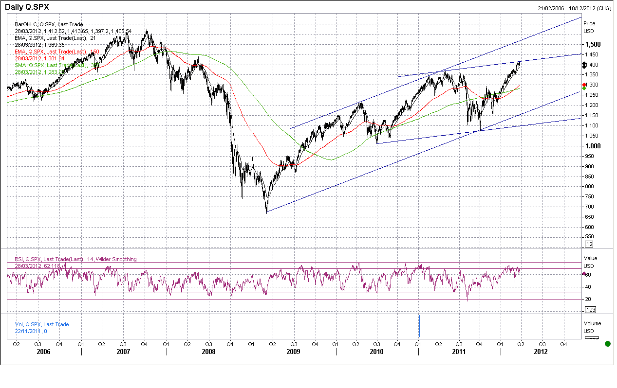 Summarsumarum. Jag tror fortfarande Asien är smått leading. Inte SPX. Det är möjligt att vi kan studsa upp från det tradingintervall, se nedan chart. Men gör vi inte det så bryter vi ner och då kan det bli rätt sur börs. Hur översätter vi detta på SPX? Jo om Asien studsar här och drar upp mot taket i intervallet, då orkar SPX bryta gamla toppen, och då är det den brantare trenden vi kan hålla oss till (se chart nedan). Då är det möjligt att Haussen håller i sig några månader till, och det är korta dagsrekyler som gäller. Alternativt bryter Asien ner, och därmed skulle SPX toppat ur nu, och då är det den mer flackare trenden man ska förhålla sig till. Ett brott av 1386 skulle eventuellt kunna vara en signal. Mål i en riktig rekyl ligger kring 1250. OMX då? Tja den hänger med som svansen på hunden, precis som vanligt!