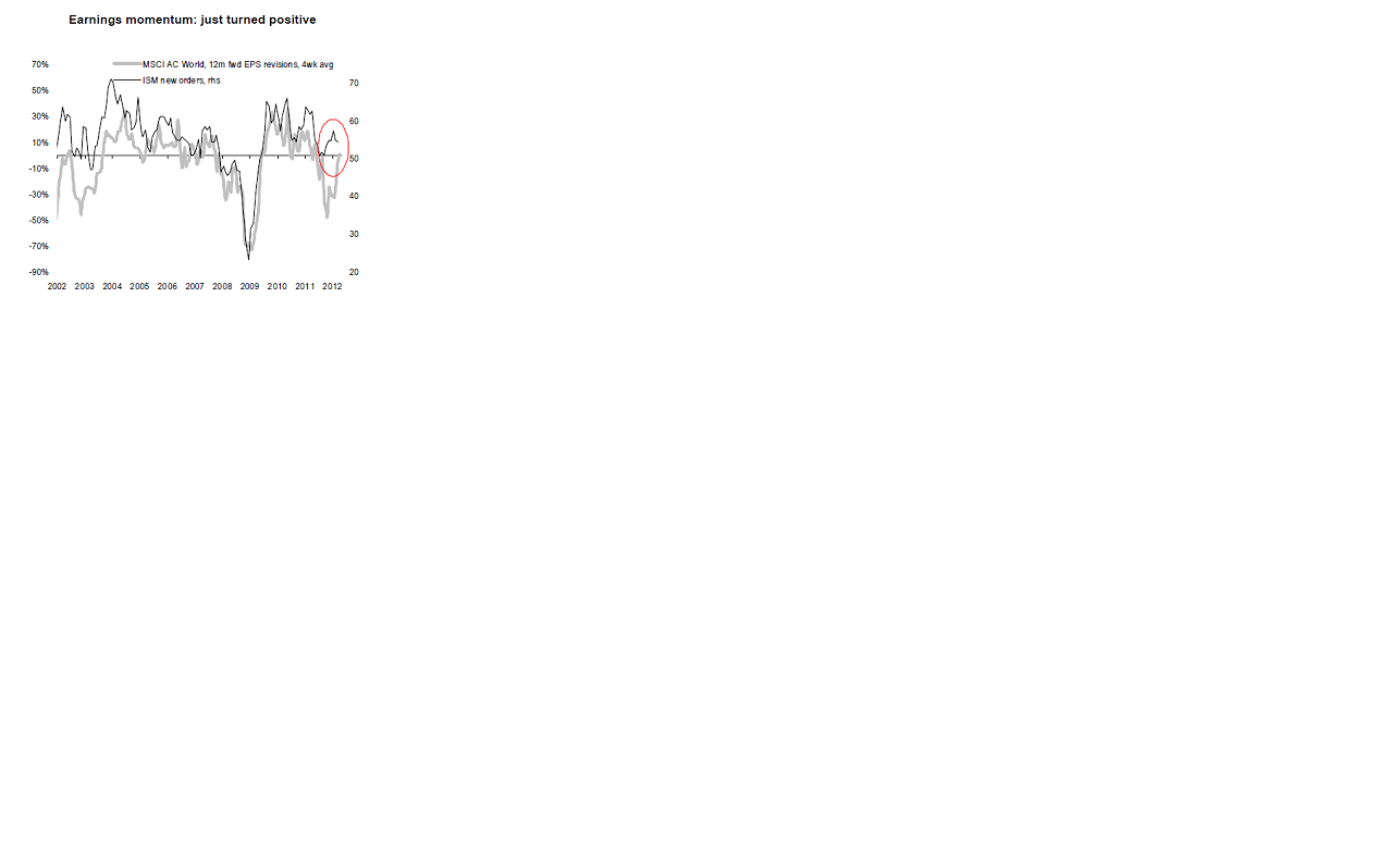 Lätt att vara efterklok, Bifogar ett chart som säger att Grekkrisen, AAA sänkning i USA m.m förra hösten skrämde skiten ur Strateger/Makroekonomer etc som fick dem att sänka prognoserna över tillväxten. Detta tvingade i sin tur de stackars aktieanalytikerna att sänka sina vinstprognoser. Med Facit i hand kan vi konstatera att verkligheten inte blev fullt så dålig som de räknat med. ISM vände ner, men studsade vid 50. De pessimistiska analytikerna har sedan dess snällt fått revidera upp prognosen (från negativ fwd EPS till mindre negativ fwd EPS). De har helt enkelt fått revidera ikapp med verkligheten. Börskurserna har sedan slutet på sep/ början på okt hängt med upp med revideringarna.