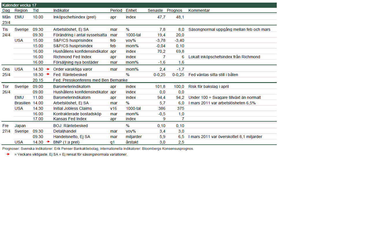 I veckan är det FED möte och Q1 US BNP på fredag… när ska ECRI få rätt sitt recessioncall den 30 september 2011. Även en trasig klocka visar rätt tid två gånger om dygnet.