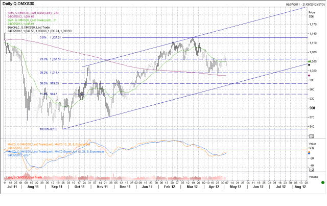 Fundamentalt finns det alltså anledning att bli så smått positiv, vilket alltid betyder Buy on Dips, dont chase the rally! Med tanke på att datan kommande 2-3 månader faktiskt kan bli ganska dålig (dvs lagging data) så kan det just skapa köplägen! Okej, det tekniska läget då? Det har varit betydligt mer svårtolkat och jag har haft en del rätt, men mycket fel också! Jag tycker toppen i mars på 1127 känns oavslutad, men jag tycker även botten i april på 1004 känns oavslutad. Stödnivåer att bevaka är 975-995, som då känns som bra köplägen, särskilt med tanke på vad fundamenta säger. På ovansidan finns ett litet motstånd kring 1040-1050, men i övrigt siktar jag på gamla toppen 1183. Det faktum att vi inte lyfter trots ok data från Kina och ISM gör att jag är lite tveksam. En klok kollega till mig sa så här, många väntade sig rekyl och sålde i slutet av februari. Mycket riktigt föll det rejält under en dag ner till 1055, men sen tvärvände det upp i början på mars (med flertalet gap) vilket skrämde många, som fick dem att hoppa på tåget igen, med snittpriser över 1000. När sedan fallet kom i april satt de snett. Vilket gör att när börsen nu steg upp mot 1070 häromdagen på bra data var det många som sålde igen. SEn hade du alla fyndköparna kring 1004-1014, som tog hem korta vinster. När de här säljarna är klara, och datan inte blir för jävla risig (trots att den inte är leading) så kan det börja stiga igen. Men det kan alltså bli sämre innan det blir bättre!
