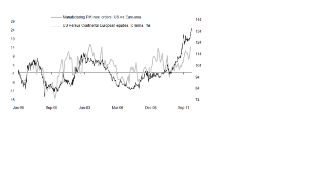 Tittar man på spreden mellan PMI new orders i EZ och US, så har den inte varit så stor sedan 2003!!! Amerikanska aktier har sedan 2007 massivt outperformat Europeiska. Så att mannen på gatan tycker USA verkar se bättre ut än Europa, och har en förkärlek för Amerikanska aktier vs Europeiska… det är inget nytt utan till stor del inprisat.