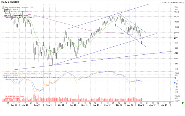 Nu är det många chartister som är besvikna över att den stigande trendlinjen inte höll och tar sikte på den STORA stigande trenden. Det vill säga den som binder botten från hösten 2008 och botten hösten 2011. Den ligger idag på ca 900. Det finns även ett gamalt gap kring 899. Visst kan det gå dit, det är inte det jag säger. Men precis som många tittade efter 1140-1150 för några månader sedan (där fallande trendlinjen från topparna från 2007 och 2011 möttes upp) så ville inte börsen hela vägen, det vände ner på 1128 isstället. Precis som i höstas, jag vet ingen som spikade 833 botten.