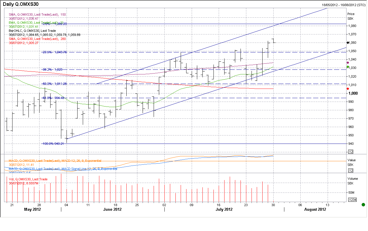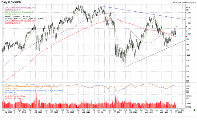 Bortsett från att det kommer en massa viktig data i veckan som snabbt kan sätta sin prägel på marknaden så är den tekniska bilden fortsatt positiv. Mitt case är att vi ska nå 1080-1085, och därmed fylla det gamla gapet från i våras. Därefter finns det goda skäl att tro på en paus. Skulle vi mot förmodan fortsätta så är det för att testa den gamla toppen 1128, och i så fall troligtvis passera den! Men jag tror vi ska pausa innan vi tar det 5% språnget. Med tanke på att marknaden är så sentimentsdriven och orolig så bör man i vanlig ordning jobba med stopp. Vid en rekyl har 1010 området blivit viktigt. Vi har ett gap på 996 som också ska testas. Lång under detta bör vi inte gå för att man ska ha en någorlunda positiv syn tekniskt.