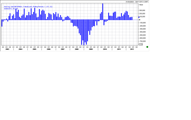 6/7 NFP kom in på 80 k mot väntat 100k. Svagare än vad andra guidande data har skvallrat om… Q212 blev ett svagt kvartal ur sysselsättningssynpunkt, och kom ihåg att sysselsättning inte är leading. Den dåliga datan i Q2 säger just att Q2 var ett väldigt svagt kvartal, vilket vi lär se i BNP siffran längre fram. Men detta är history nu, frågan är vad händer i Q3? Vänder det upp, eller fortsätter det ner?