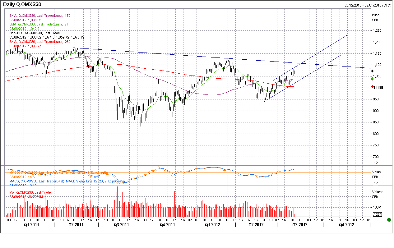 Kan denna siffra ta SPX till gamla topparna kring 1422 (+4% från här). Det skulle i så fall betyda att Stockholm kan komma att testa 1128!!! Eller är det bara så enkelt att Q212 var det sämsta kvartalet, Q312 blir något bättre, och Q412 ja då är vi i recovery mode igen! Detta skulle betyda att börsen gjorde helt rätt i att bottna under maj och börja stiga… som vanligt, god tid innan datan bekräftar utvecklingen. En alternativ tolkning handlar om QE3, dvs att börsen gått på förhoppning om QE3, och trots dålig data så fortsätter den upp. Nu kom ISM och NFP in ok vilket skulle kunna peka på att läget inte är så allvarligt, samtidigt som core inflation ligger för högt. Summanavkardemumman är att FED avstår från att stimulera… detta borde i så fall få marknaden att sura till (under förutsättning att det stigit på just den förhoppningen)