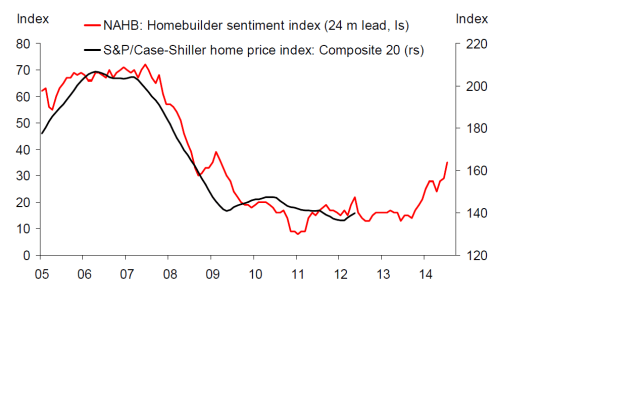 Så i mina ögon har priserna varit i princip flat de senaste 3 åren… och jag tror de kommer fortsätta med det. Men så fick jag en rapport från DB precis som säger att NAHB sentiment index leder priserna med 24 månader!!!! Det skulle betyda att priserna tar fart 2014. Det skulle också rimma ganska väl med min syn att de amerikanska hushållen är ganska färdiga med att ”de-levva” nån gång då. Skulle detta stämma så kan vi sakta men säkert ta oss ur LTG situationen under 2014. Det hade varit bra för vinsttillväxten och därmed aktier generellt…