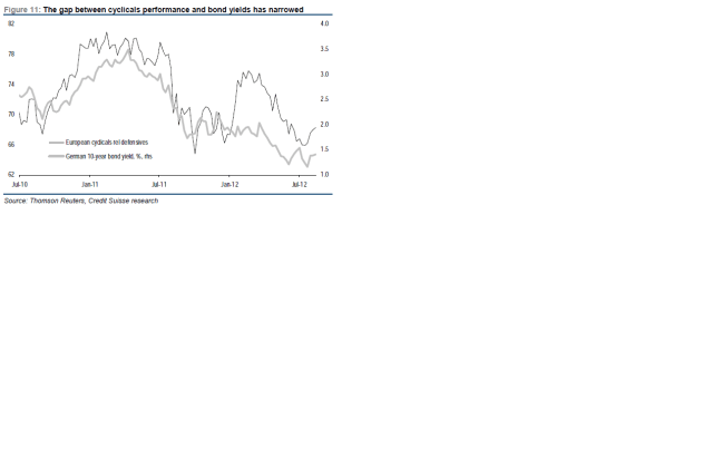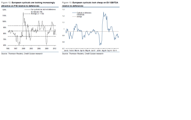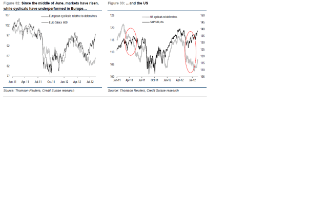 Trillat in en del rapporter på sistone… varav jag har klippt det mest intressanta. Två av rapporterna handlar om att CS uppgraderar Cykliskt vs Defensives, och den andra handlar om hur de uppgraderar Continental Europe equities till benchmark från UW.