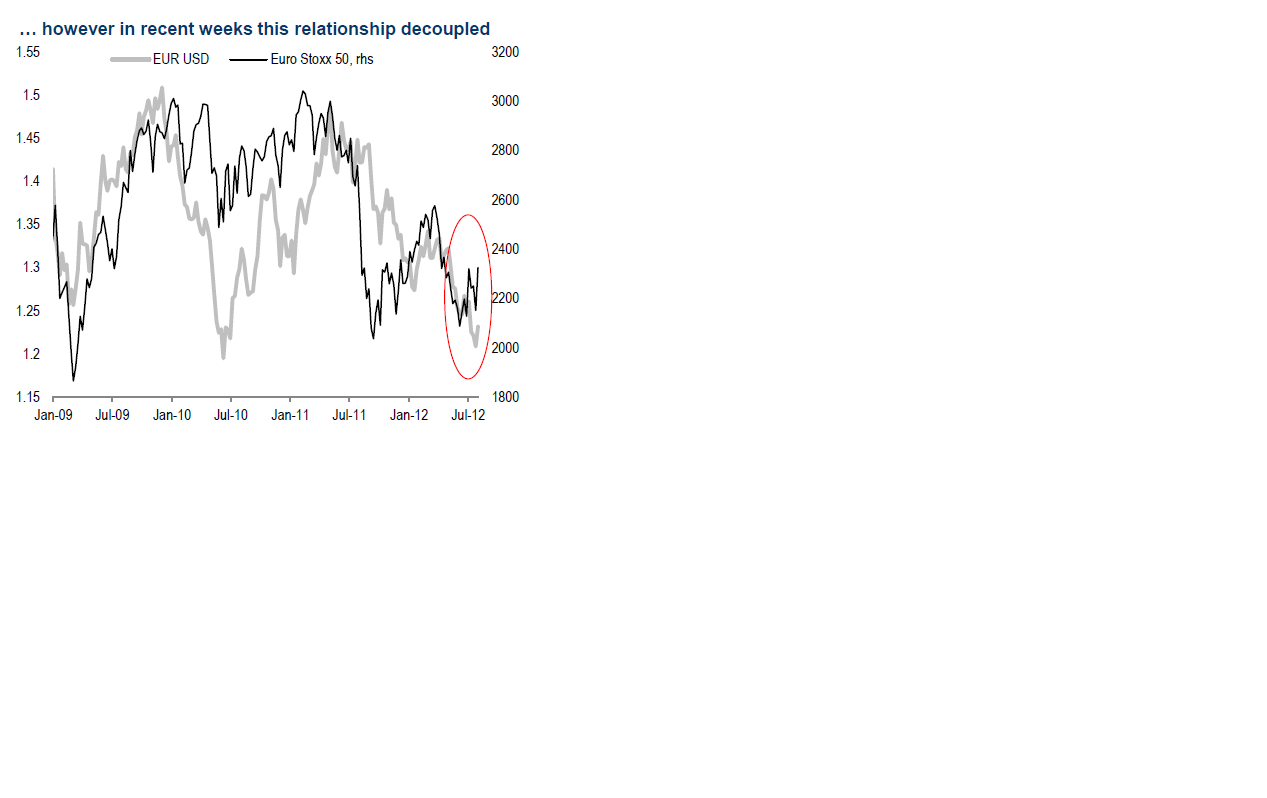 men de senaste veckorna har nåt hänt. Euro stoxx 50 har gått upp men EUR har inte repat sig i samma utsträckning. Vilken har rätt?
