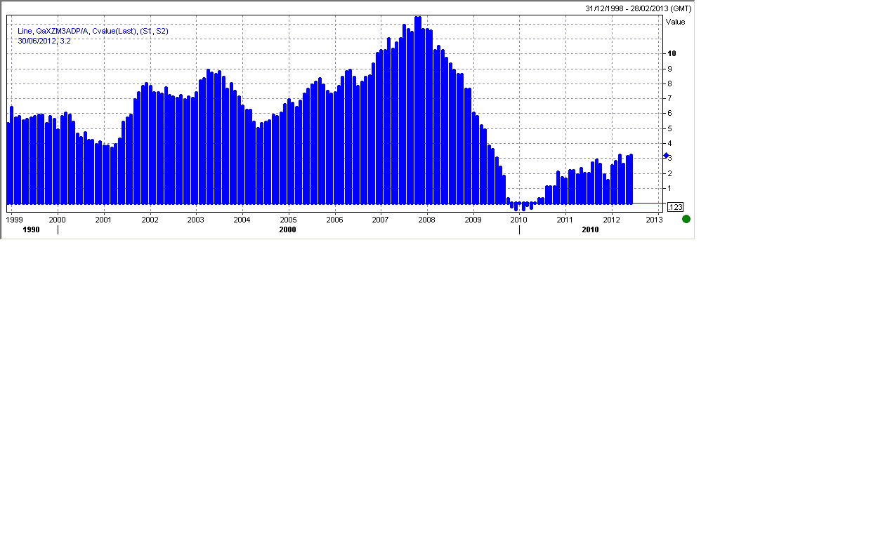 Jag vet att det inte är så många som följder den här men jag tycker det är en utmärkt temperaturmätare över konjunkturen i Europa. M3 steg med 3,8% YoY i juli mot väntat 3,2 och föreg. 3,2. Det är ingen hög nivå, men jämfört med hur det var 2009, så mår europa faktiskt bättre. Vissa konjunktur indikatoerer är ju faktiskt inne på att det skulle vara sämre idag, men det är det alltså inte enl den här, utan det går så smått i rätt riktning.