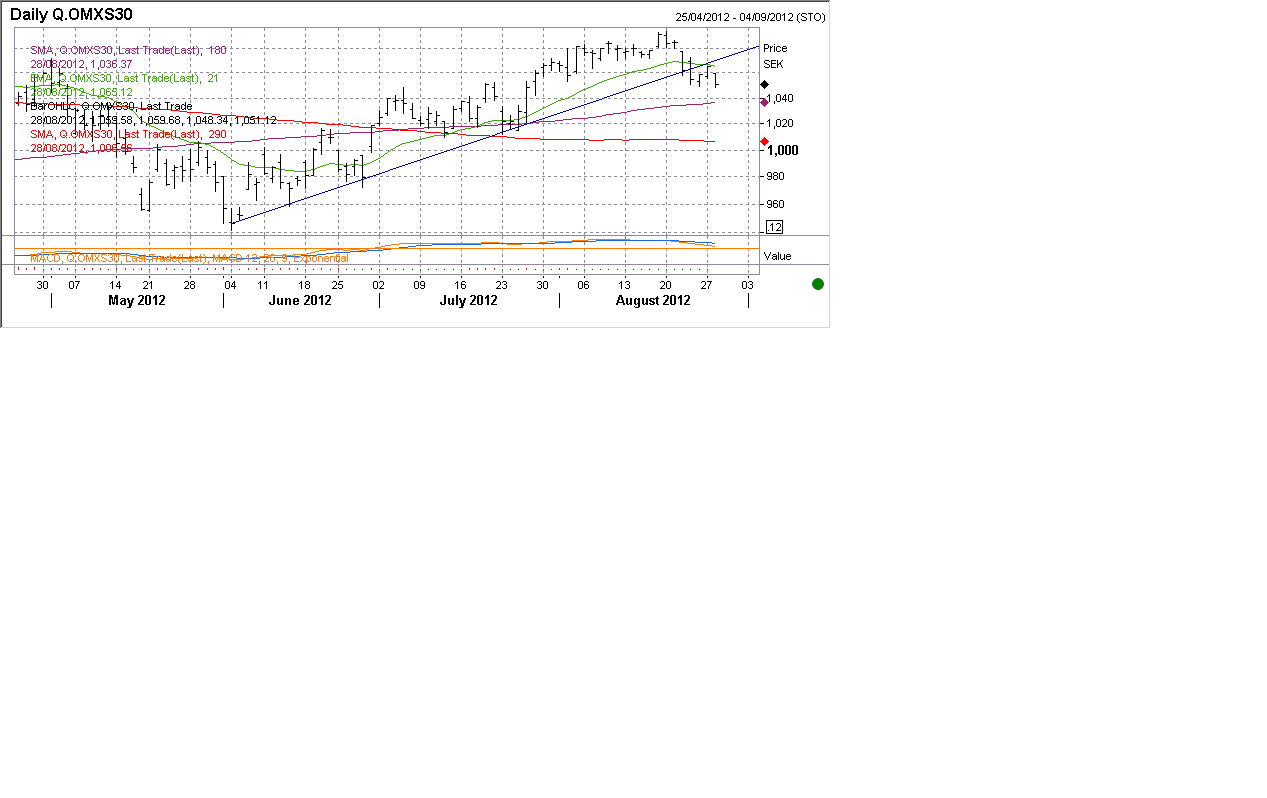 Fick en intressant analys idag där man kikar på sambandet mellan OMX30 & S&P 500 i mars månad fram till sommaren. OMX börjar vika och SP är flat eller något upp. Omx rekylerar sedan upp innan de båda följs åt neråt. Detta ska enligt analysen bero på att man säljer av högbeta placeringar först. Om man då tittar på de senaste tio dagarnas handel kan man skönja ett liknande samband. Frågan är om detta mönster skulle upprepa sig. Ganska intressant tycker jag.