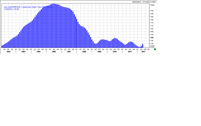 nedan visar Prisindex i absoluta termer, nedan senaste stapel visar alltså maj månad. Den senaste för juni ligger på 142. Min tes är fortfarande att vi måste upp ca 20% från dagens nivåer innna det börjar ge realekonomiska konsekvenser. Å andra sidan, skulle det hända närmaste året…. då är konsekvenserna av YTTERSTA vikt för hela globala ekonomin. Visst kan uppgångar vi sett de senaste ge positiv inverkan på sentimentet… men knappast nåt mer.