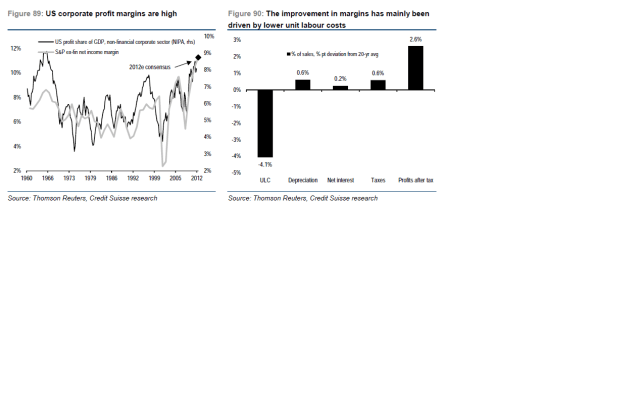 De tar även upp det här med peak margins. Men de slår fast att större delen av marginal förbättringen kommer från att företgens lönekostnader har ökat i BETYDLIGT långsammare takt än SALES. Vilket i sin tur beror på att IT gör att färre gör vad fler gjorde tidigare, och att en del av lönerna idag går till billig tillverkning i Asien. Så de menar att de är high for a reason,….. och marginalerna börjar inte krympa förrän output gap stängs och löneinfaltionen tar fart.. och där är vi inte på lång vägar!