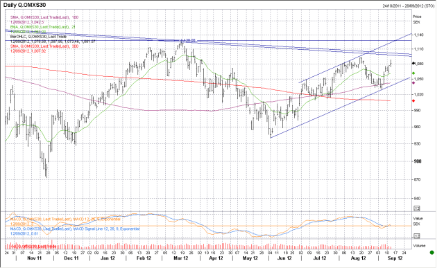 Marknaderna fortsätter uppåt, och OMX har bla. stängt sina gap på 1063 och 1080. Nu är vi helt gapfria. Nu väntar förra toppen på 1094, som jag förväntar mig att vi fixar, sen fallande motståndet kring ca 1100. Det finns även potential, särskilt om det kommer nåt nytt, att vi orkar nå gamla toppen på 1128, som dessutom är taket i stigande trend (se chart nedan). Huvudsceanriot är att vi vänder ner från att ha toppat ur kring 1100-1130. Därefter följer en lugnare period innan vi tar nya tag mot vårt slutliga target 1183. Det senare kräver dock att makroindikatorerna vänder upp på allvar, inte bara slår förväntningarna som surpriseindex visar. Viktigt stöd vid en range bound rekyl är 1060. Så länge som dagens underliggande optimism finns där så lär det stödet hålla! Efter det har vi 1050-1055, 1028 samt hela området 990-1020. MEn som sagt, så länge som vi har optimismen kring EZ paketet, och om Makro surpriseindex vill fortsätta att stiga….och FED inte strular till det… ja då borde rekylerna bli ganska klena!