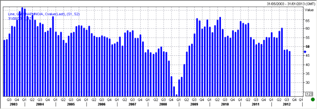 summarsumarum… amerikanska tillverkningsindustrustrin har förhoppningsvis bottnat ur, och stärks så sakterliga. Detta borde marknaden gillar. Särskilt med tanke på att vi har både QE3, bättre huspriser och hyggligt consumer confidence. Nu saknas bara en klart bättre än konsensus Jobbsiffra och lite optimism från europa så borde saken vara biff 🙂