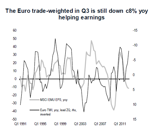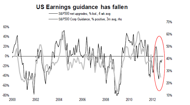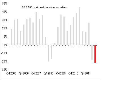 Q312 EPS i USA ser ut att bli negativa jmf Q311. Det i sig är inte negativt för börsen. Neg Revisions är. Så frågan är om detta är början? Givet ISM new orders, Earnings revisions, etc tror CS att de vänder upp i Q412 YoY%.