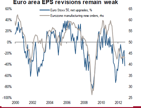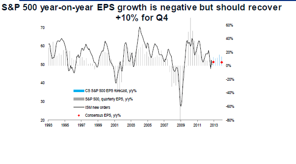 CreduitSuisse släpper en rapport där de sänker EPS 2013e. I USA tror de på 4% tillväxt nästa år, mot konsensus 11%. I europa tror man på 2% mot marknadens 15%.
