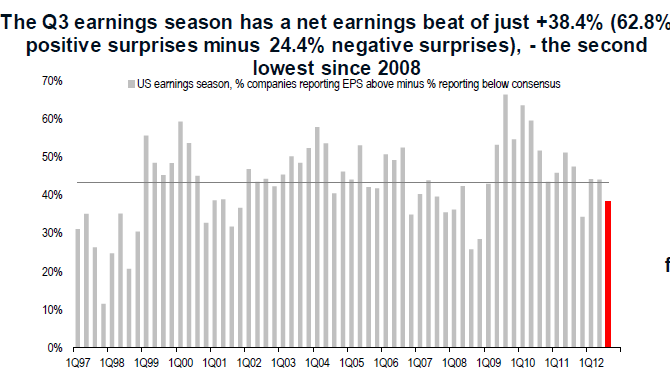 Ang topline, Net positive sales surprises in the Q3 earnings season in the US so far, at -20%, are the worst since Q4 2008.