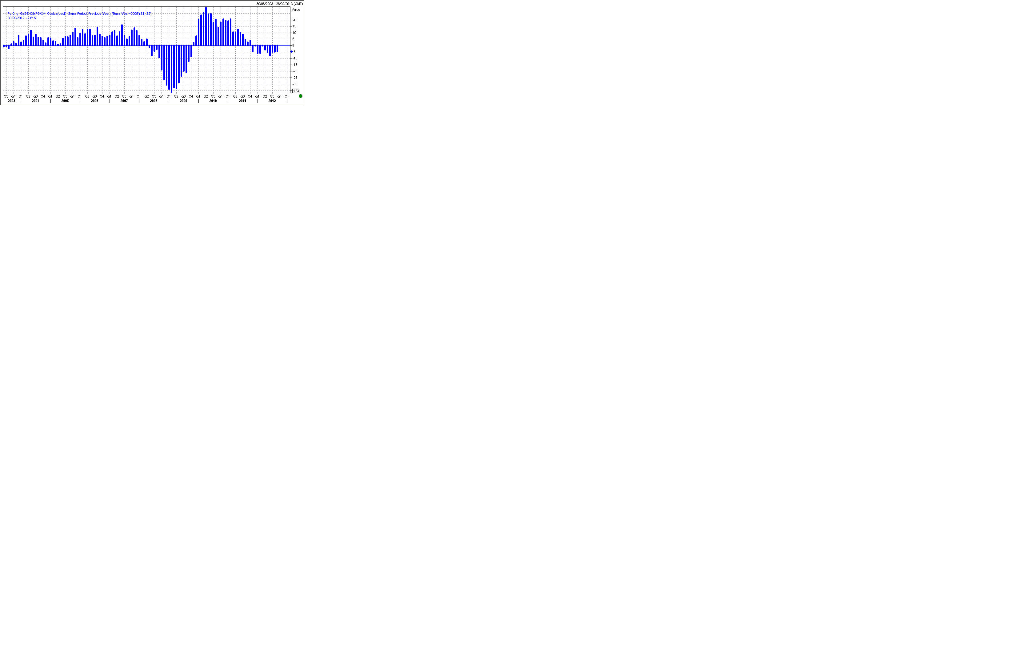 Men 2012 borde vara ett minne blott. 2013e är det som räknas!! Men även där ser man liknande mönster. I januari i år räknade man med ca 11,5% vinsttillväxt under 2013. Den klättrade så sakterliga mot 13% efter sommaren. Sen kom Q2 och estimaten började falla ner mot 11,5 igen! Men Q3 har drivit på revideringarna ytterligare och nu är man nere på en vinsttillväxt på 10,5% för nästa år. SPX toppade ur i början av september och har sedan dess följt med revideringarna ner. Hur blir det framöver? Tja, får man tolka ISM New order etc så borde revideringarna bottna ur snart. Samtidigt är det många som menar att 10% vinsttillväxt nästa år blir tufft. Det enda jag vet är att ju snabbare revideringarna faller, desto snabbare kan de bottna ur!!! Det är roligare att gå in i 2013 men noll i förväntningar än med 15% om ni förstår vad jag menar.