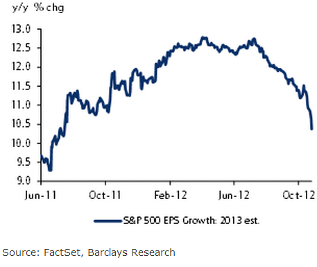 Sen kan man analysera det vidare. Att vinstrevideringana för 2012e vände ner under sommaren är kanske inte så konstigt med tanke på hur svag ekonomin har varit under 2H12. Estimaten låg helt enkelt för högt under våren. Ledande indikatorer som ex ISM New order dippade ju rejält under Juni, och även juli/aug siffran var svag. Så det känns ju rätt relevant. Troligtvis är det så att pga att man reviderar ner Q3/Q4 så följer 2013e med av bara farten. Det är ju frågan om det kommer visa sig vara rätt? ISM har ju vänt upp sedan september, och andra indikatorer med för den delen. Kanske 13e inte behöver bli så dåligt. Sen är det frågan… 13e nivån låg på 13% tillväxt nästa år om du frågade analytiker kollektivet i våras. Kanske var nivån i sig för optimistisk. Förstår ni vad jag menar. Nedrevideringarna under hösten kanske bara är relavanta för 2H12, men inte 13e… men kanske låg man nivåmässigt för högt under 13e innan så nedrevideringarna kanske ändå har varit rätt. Trots att vi ändå ser en konjunkturell återhämtning under 13e.