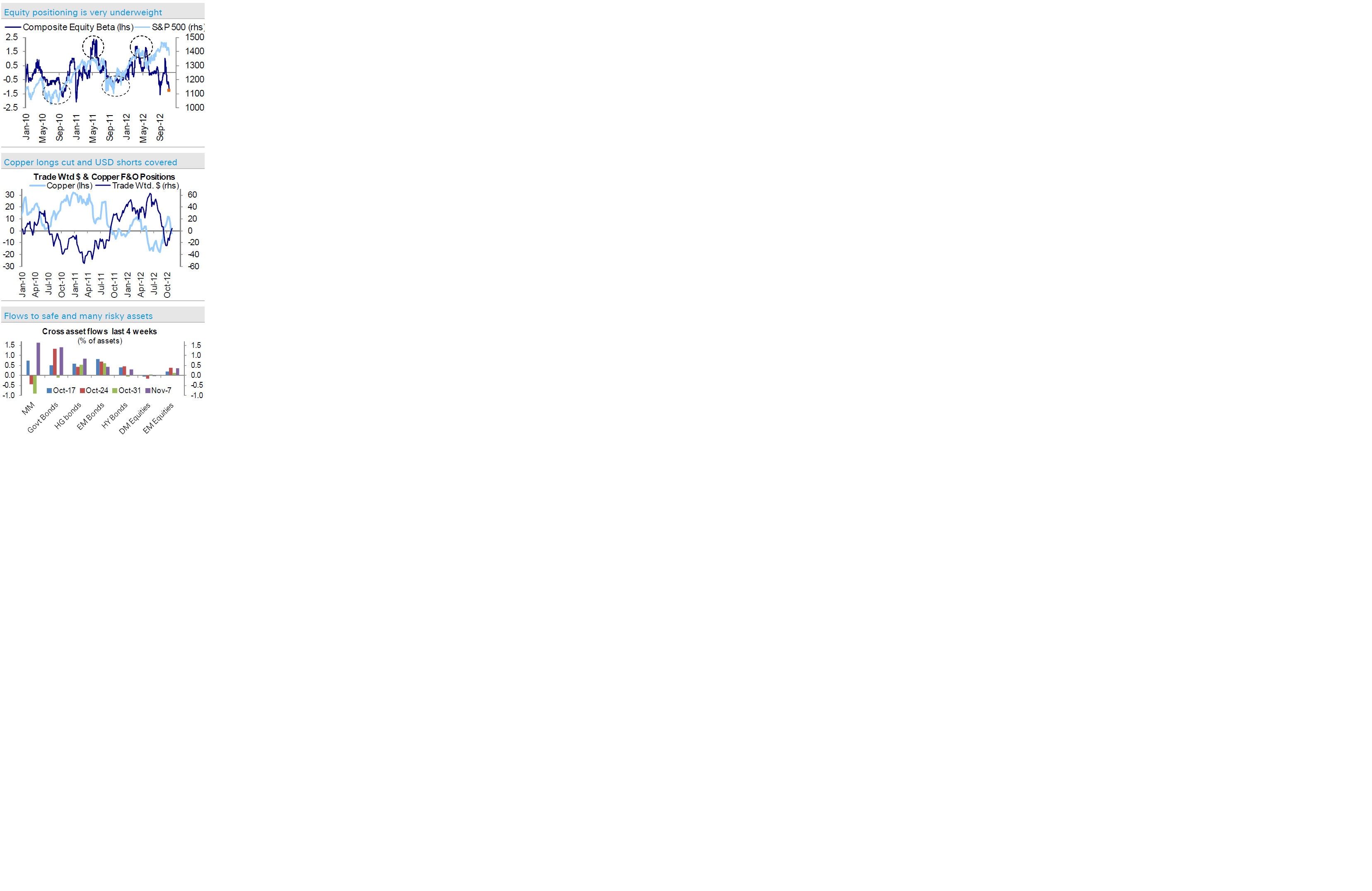 Mutual funds, dvs vanliga långfonder, Hybrid funds, typ blandfonder och longshort hedgefunds har samtliga lagt sig underviktade… den enda som ligger kvar med sin övervikt är makrofonder. Det är ju nästan ironiskt, eftersom jag tittar en hel del på makro och är rätt positiv. Är kortsiktigheten och oförmågan att se ”around the curve” i kombination med svaga Q3 som gjort att man viktar ner, och makrofonderna är smarta….. eller har den senare kategorin missat nåt och Fiscal cliff m.m kommer innebära att 2013 blir tufft, och vinst nedrevideringarna bara har börjat???? JAg vill ju inte tro på detta!