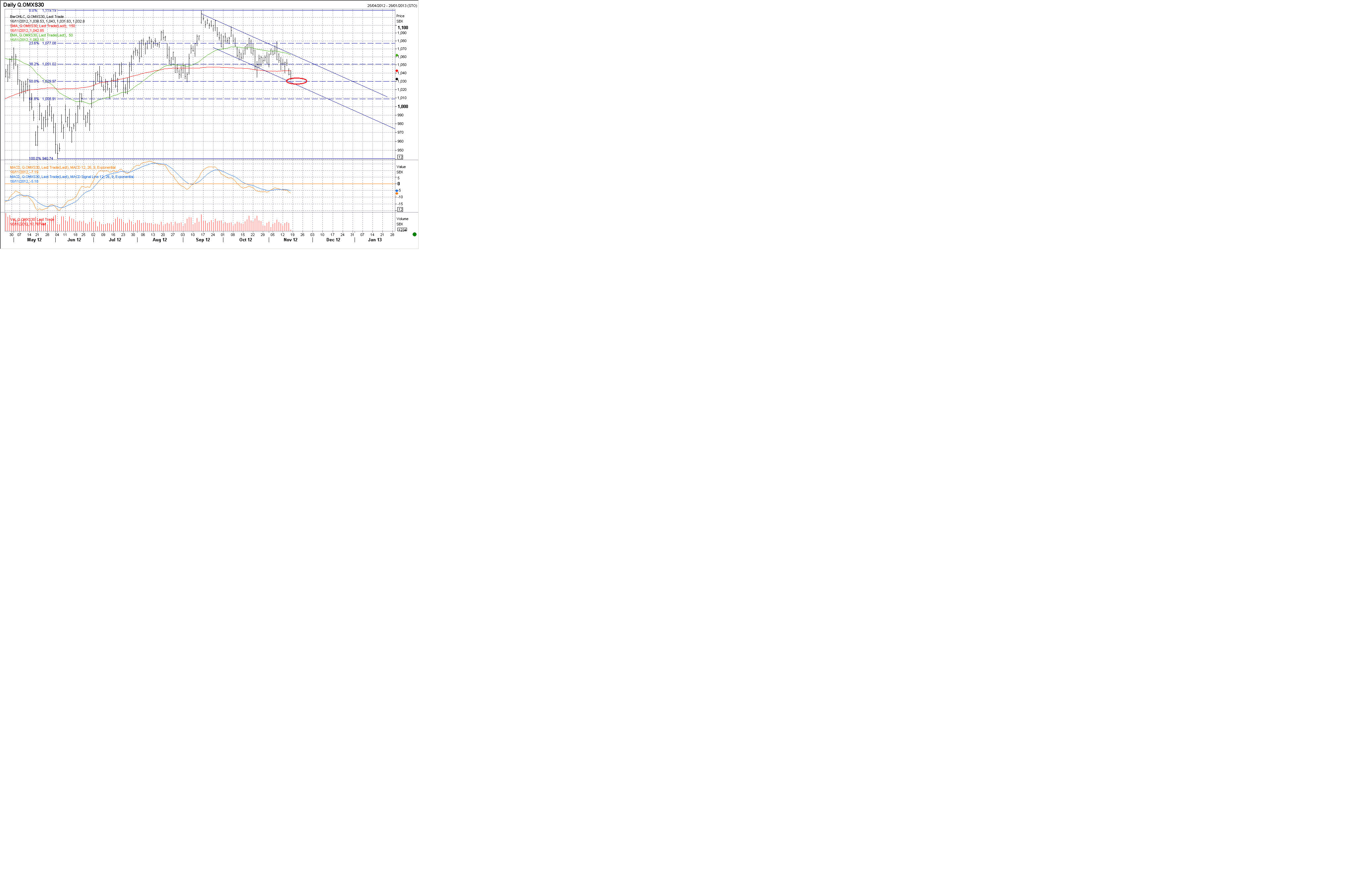Fundamentalt är man positiv, Tekniskt är man positiv, men bryter vi ner här är jag beredd att bli tekniskt negativ (med Stop loss). Vi har ett gap på 1049, så den spekulative kan ta en säljsignal, som iofs brukar vara ett kort köpläge, och avvakta till vi når 1049, och väl där överväga om man fortfarande ska vara tekniskt negativ.