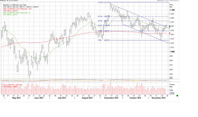 Har varit rätt stark börs senaste dagarna… gapet var ju inga problem att täppa till. OMX fortsatte upp och lyckades till och med stänga over fallande motståndet. Men det gjorde den sist ocksa så det kan man inte lita på. Hursomhelst är styrkan välkommen då det gör mig mer komfortabel att 1027 var botten. Så länge som den håller har jag target 1183. Skulle den passeras så fallerar 1183 target, och strategin ”sell the rallies” är att föredra. Men än så länge är vi positiva. Börsen har gått start de senaste dagarna och en rekyl känns inte omöjlig. Vi har motstånd kring 1074 som är föregående högsta stängning samt FIB50%. Men för att vara riktigt säkra på att nå 1183 så bör vi notera en högre topp än 1080. Tror att SPX kan gå mot 1400-1410, innan rekyl om vi har tur. Rent taktiskt är det buy the dips som gäller!
