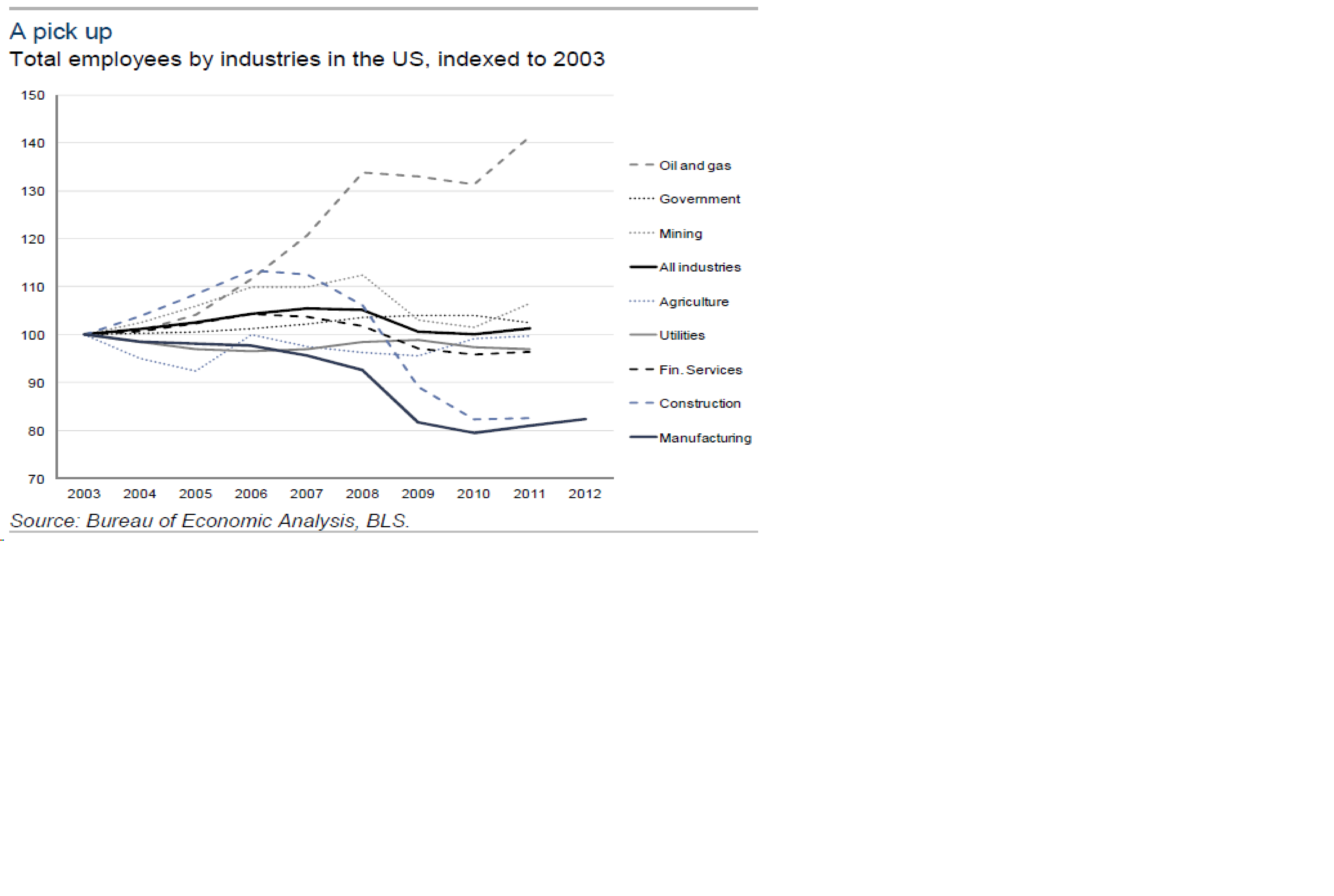 Se nedan på jobbskapandet i Amerikanska industrin. Inom bygg och tillverkning är det dåligt, vilket man visste. Men att det skulle vara så bra inom Olja- och energi… visst jag har varit på en del Shale gas/ Skiffer Olja presentationer och att USA ska bli självförsörjande osv… men att det hunnit skapas så mycket jobb!!!!! Det hade jag ingen aning om!!